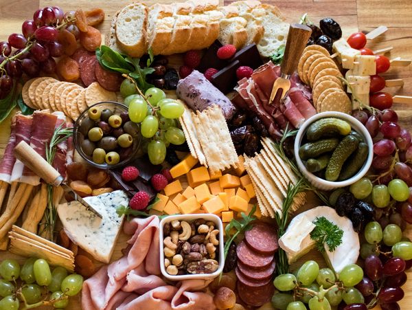 Various cheeses, meat, cheeses, crackers, breads, vegetables, olives, fruits, honey, dips, preserves and chicken salad upon request.